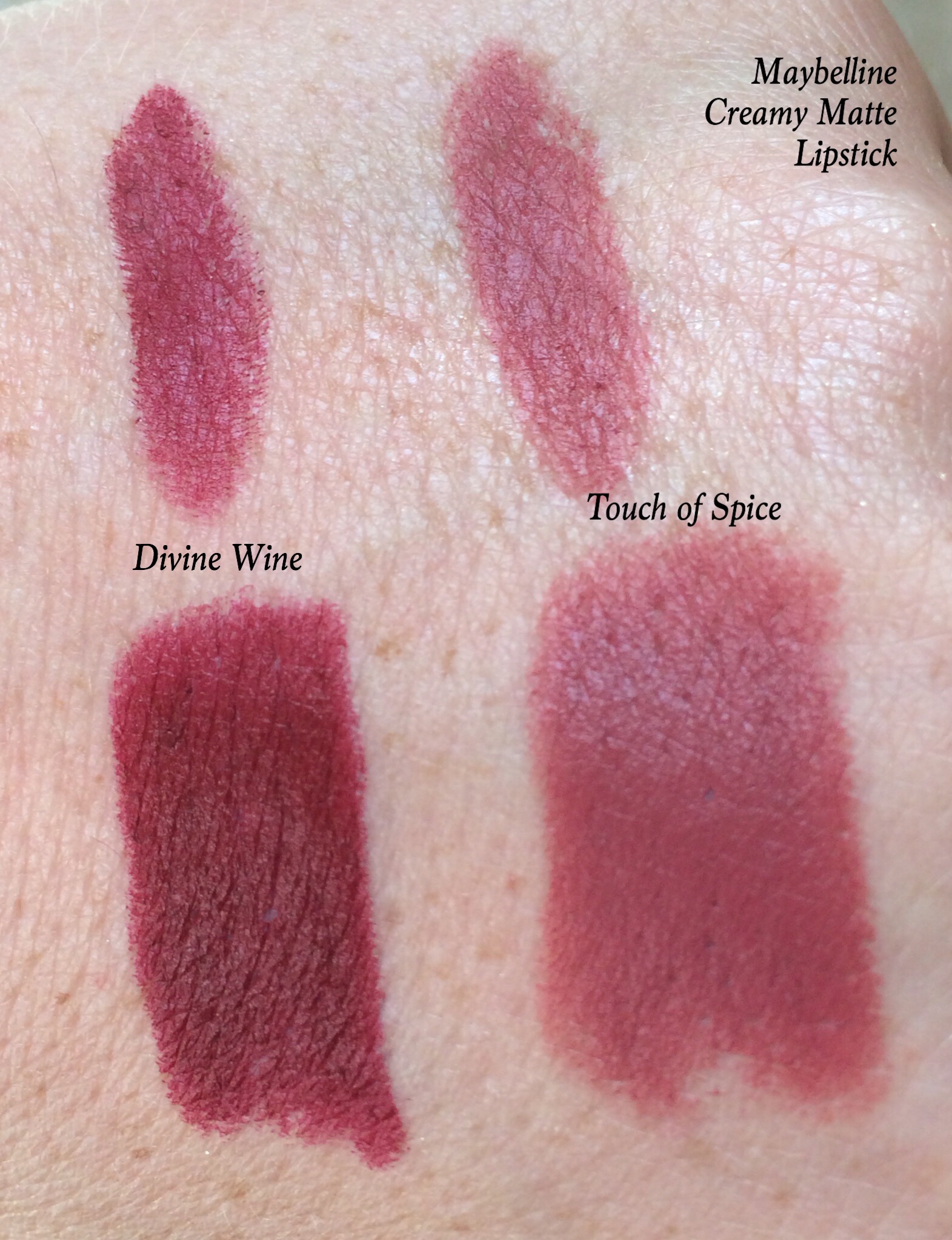 Maybelline Color Sensational Creamy Matte Lipsticks in Divine Wine and a Touch of Spice– I haven’t worn either of these beyond initially trying them on so the only thing I can say is that they feel pretty nice upon application but might be prone to a patchy application. I’m not completely sold on these being flattering colors on me but they are undoubtedly pretty shades on their own. They have the normal Maybelline lipstick smell (a little like play dough) but it doesn’t seem as intense as say the Vivids line.