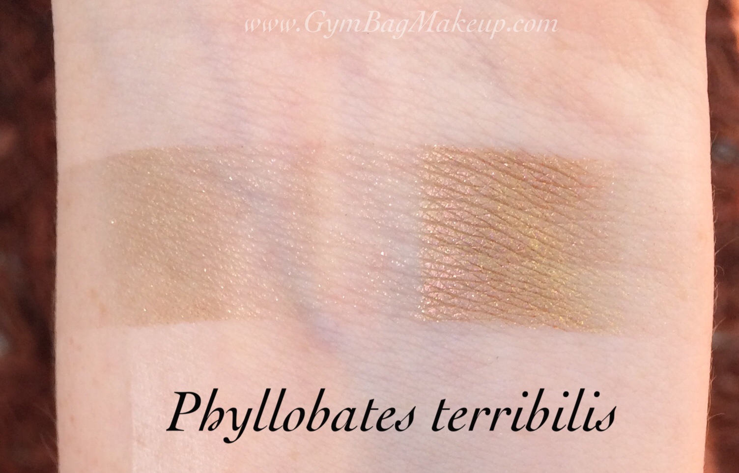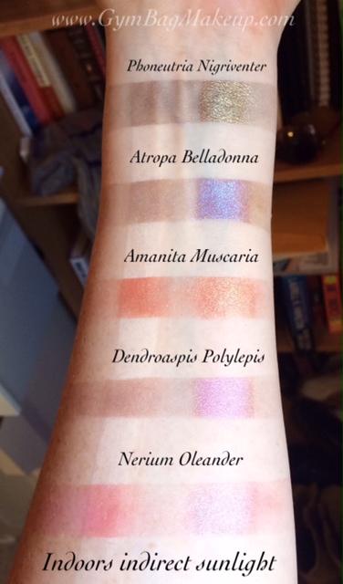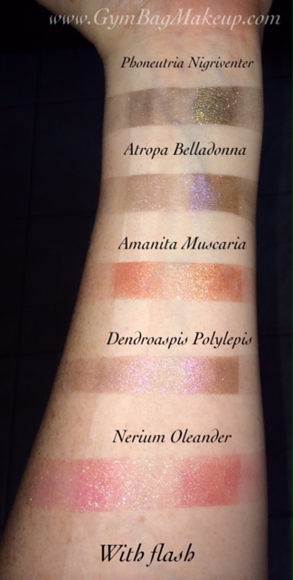 When I first heard that Aromaleigh’s Halloween collection was going to be based on poisonous and venomous deadly things, I was slightly intrigued. When I saw the swatch photos that were posted on the Facebook page (they are now posted on Aromaleigh’s website) I was completely agog. So naturally, I placed an order for teensy tiny itty bitty little samples (seriously, 1/16 of a teaspoon is teeniny). And once I started wearing said samples I totally fell in love with the actual theme. I’ve completely loved googling the names of these shadows and learning about their namesakes. I mean, the shadows are really pretty, but bugs! And plants! And creepy crawly things! This is going to be a long post. Like longer than normal. So hunker down with a protein shake (did you know that GNC has a pumpkin spice protein shake that actually bears a striking resemblance to the actual flavor of pumpkin pie? It’s delightful.) and lets look at some glittery goodies and some fascinating flora and fauna.
