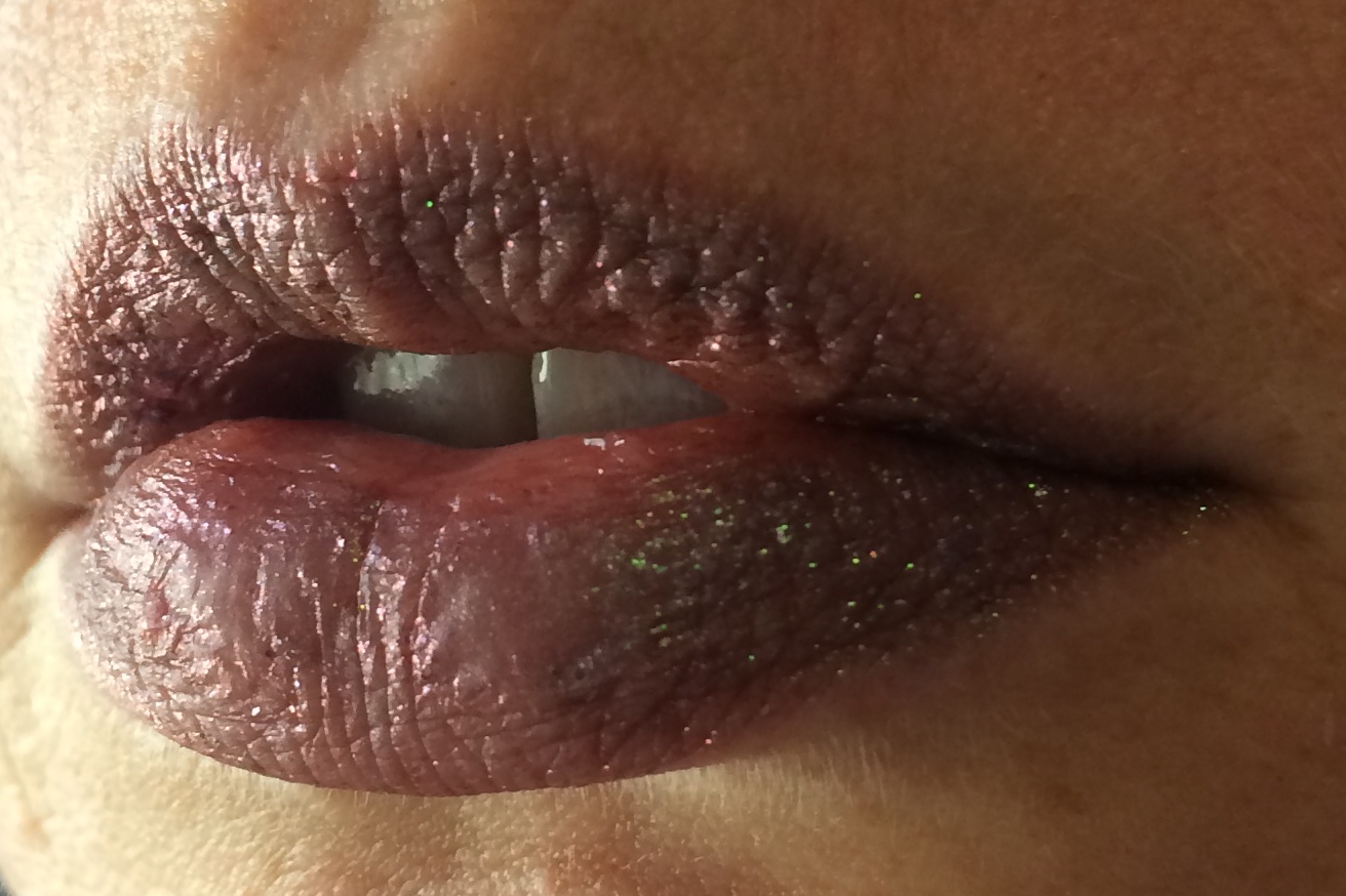 Vivid green sparkle turns bright pink to almost red to orange-yellow depending on angle and light. This shade is transparent, so if 1-2 coats are applied, your lip color will show through, but this makes it perfect to apply over lipstick (traditional or liquid matte varieties). Applying on top of red lipstick creates a very sparkly, slightly warmer version of Wizardry. Try it over black or purple. Shown here applied on bare lips in three coats, which was fairly full coverage, but the camera won’t quite pick up the true vibrancy of the green. In the tube it appears to have a heavy brownish base, but it’s sheer. As with our other shades, needs to be shaken before application. Please note: the large-particle sparkles in this shade are not prone to excessive transfer or migration, but some will transfer to skin or clothing if rubbed. Natural light can wash out the colors and effect.